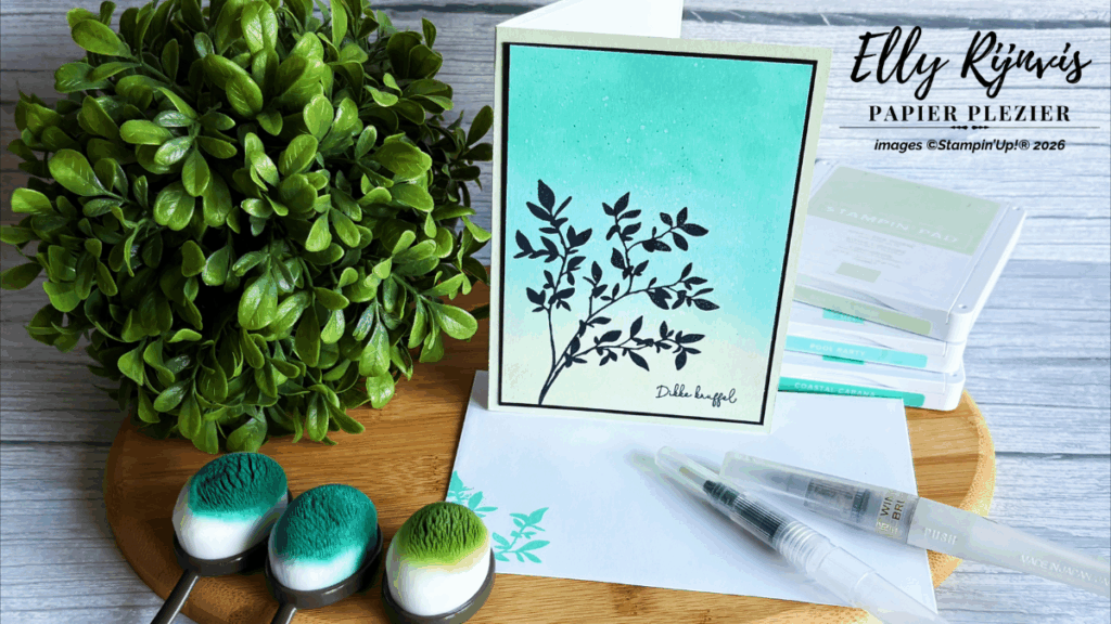 Hiervoor heb ik de tak eerst vol gestempeld met Coastal Cabana. Daarna heb ik dezelfde stempel iets verschoven nog een keer gestempeld met Soft Sea Foam, maar deze keer één keer afgestempeld.