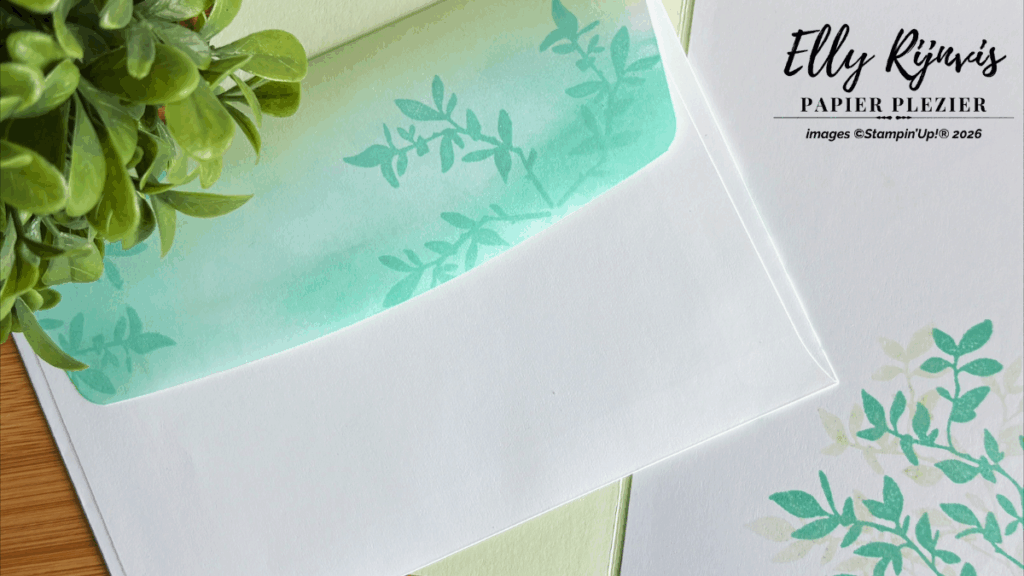 Voor deze kaart ben ik begonnen met het blenden van drie zachte kleuren inkt. Dat zijn: Coastal Cabana, Pool Party en Soft Sea Foam. Door rustig te werken ontstaat er een mooi verloop dat meteen een fijne, rustige basis geeft.