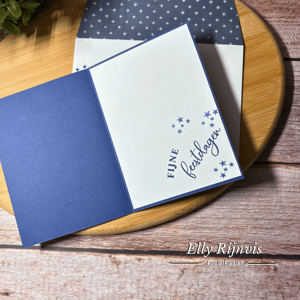 Voor de basis pakte ik Night of Navy kaartkarton, met twee eenvoudige witte matten. De binnenkant hield ik lekker rustig: een tekst, een paar sterren en inplakken maar. De voorkant kreeg iets meer aandacht, maar nog steeds kwartiertjes-proof.