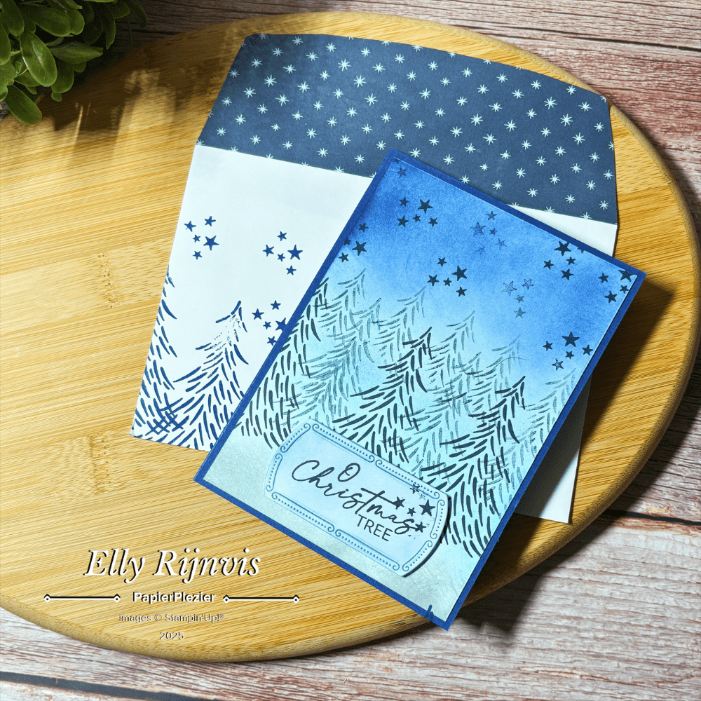 Vier tinten blauw + één dennenboom = kerstkaart klaar!