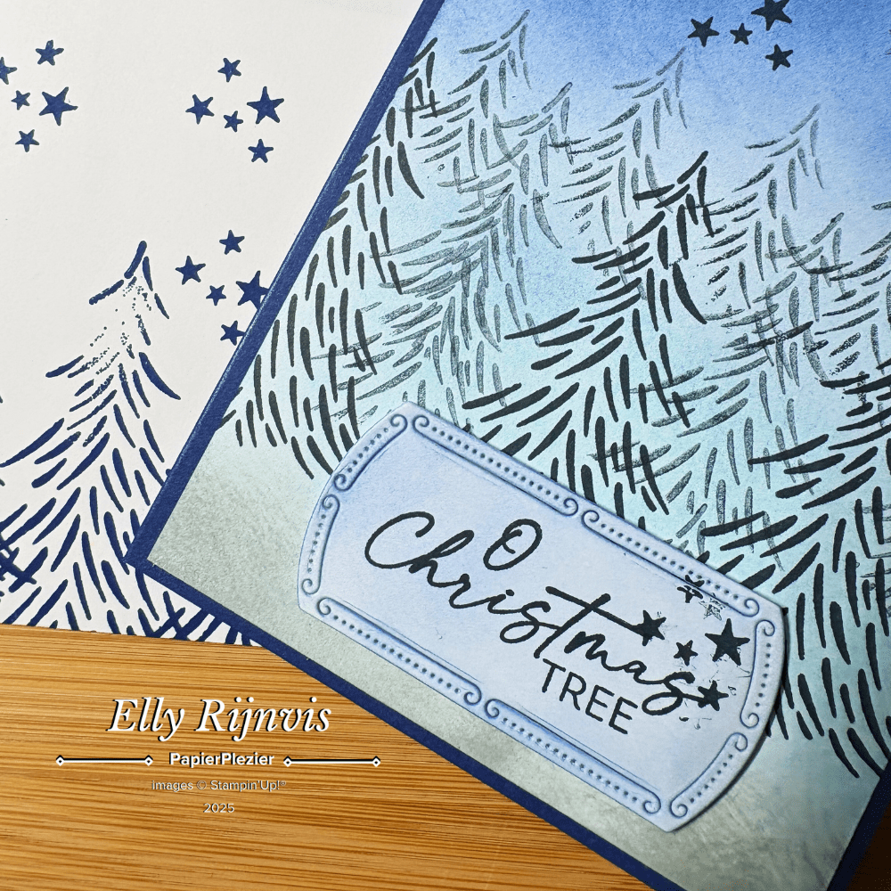 De dennenbomen stempelde ik in Secret Sea, in eerste, tweede en derde generatie (oftewel: vol, één keer afgestempeld en twee keer afgestempeld 😉). Met een strookje maskeertape zorgde ik dat de bomen niet door elkaar heen gingen dansen — zo creëer je in een paar tellen een prachtig bosje.