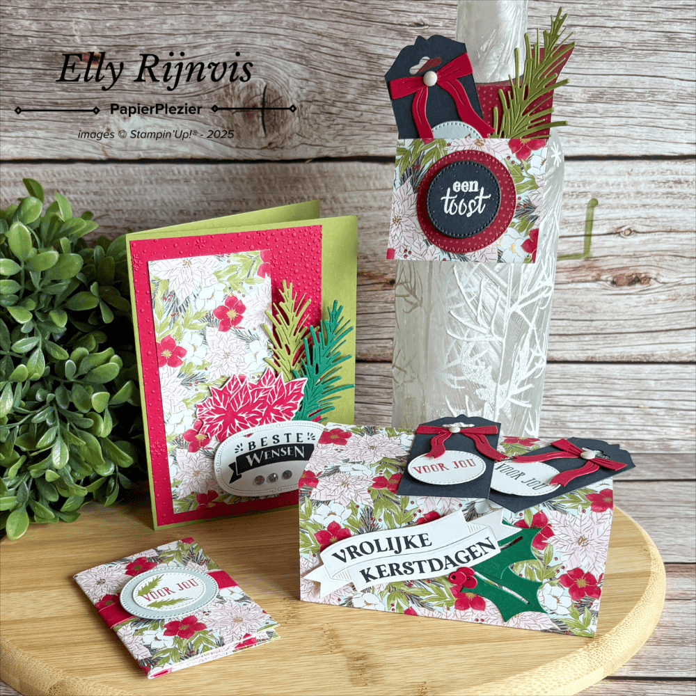 een giftcardhouder, een schuifdoosje, een flessenhanger, een kaart én vier tags.
